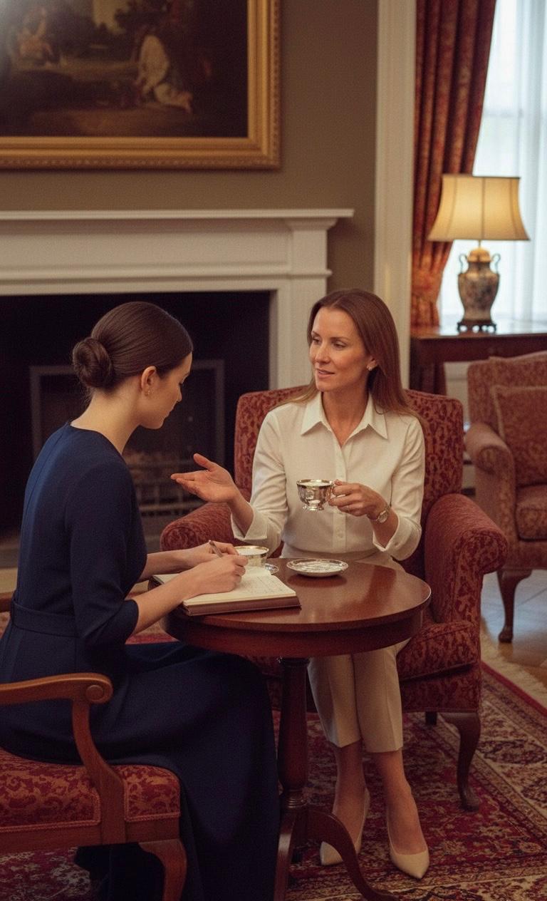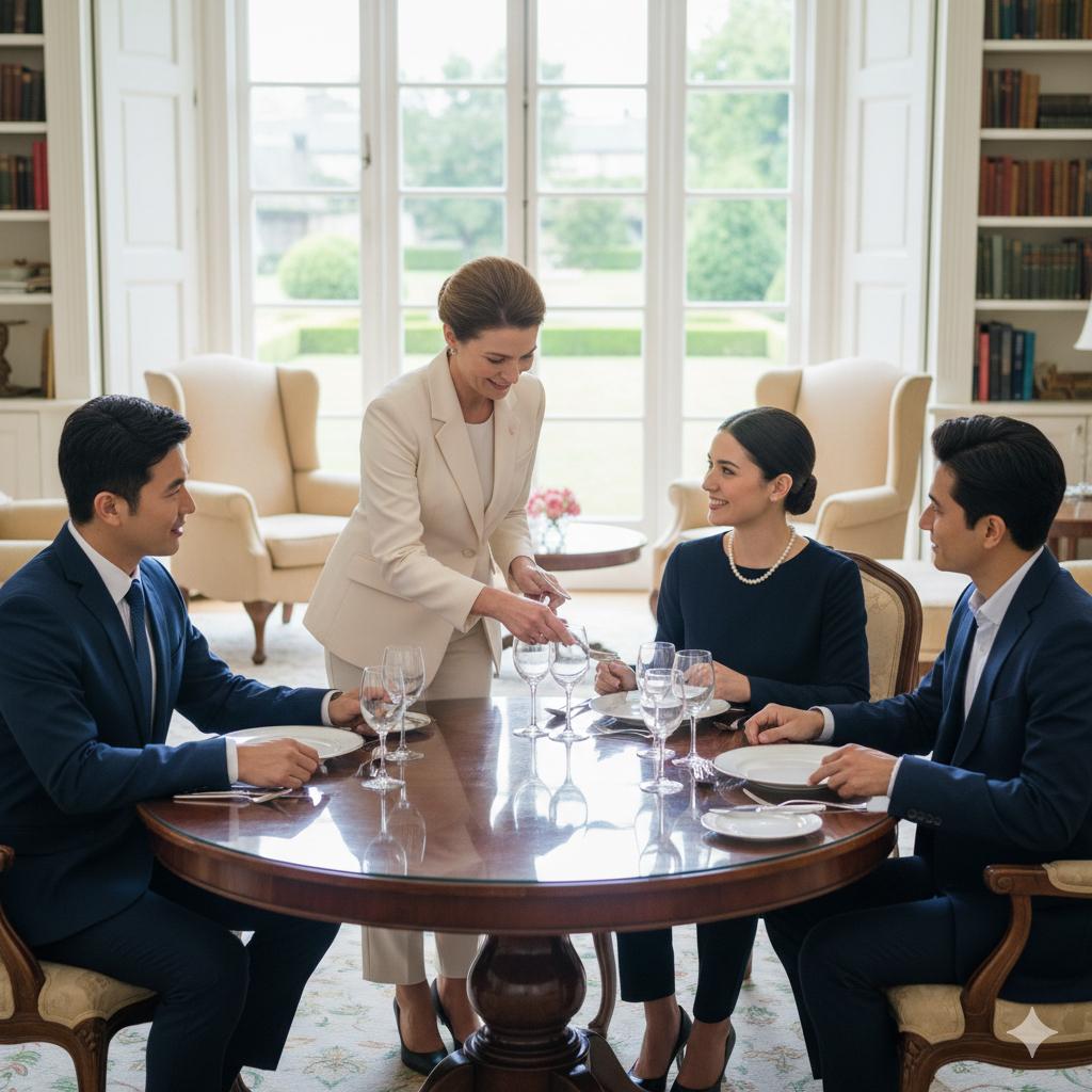 Regras de etiqueta à mesa (uso de talheres, postura, anfitriã convidada).
