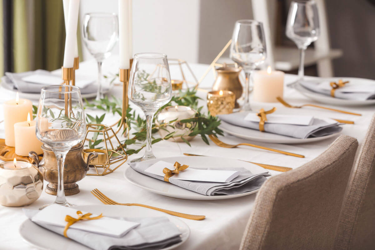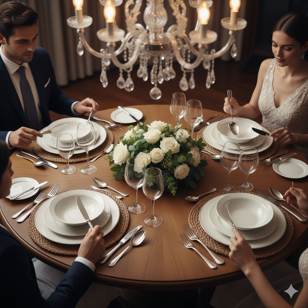 Regras de etiqueta à mesa (uso de talheres, postura, anfitriã convidada).
